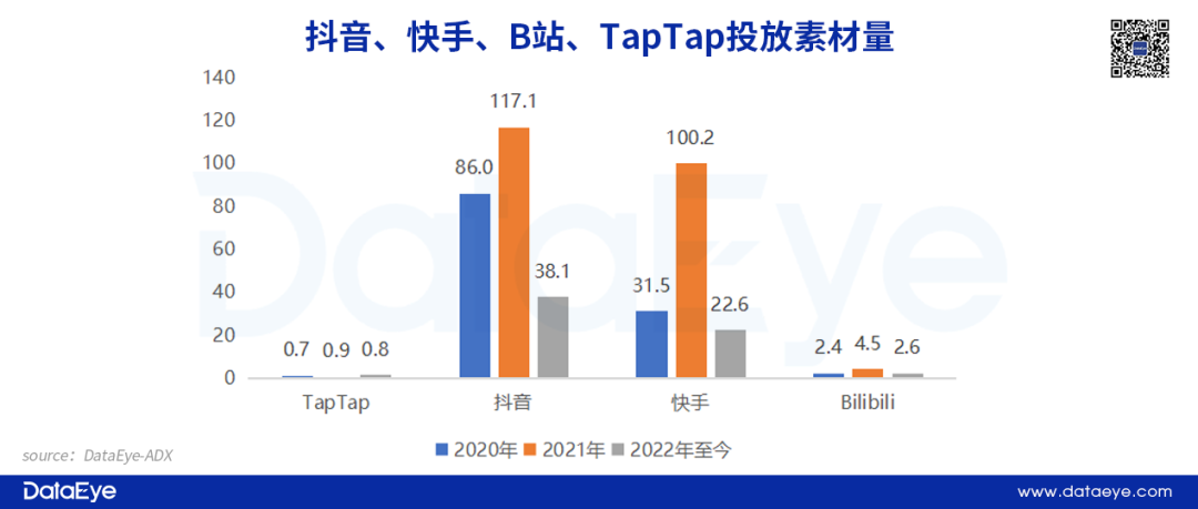 從投放素材總量來看,TapTap與抖音、快手兩大短視頻平臺相差懸殊,與B站也存在不小差距。