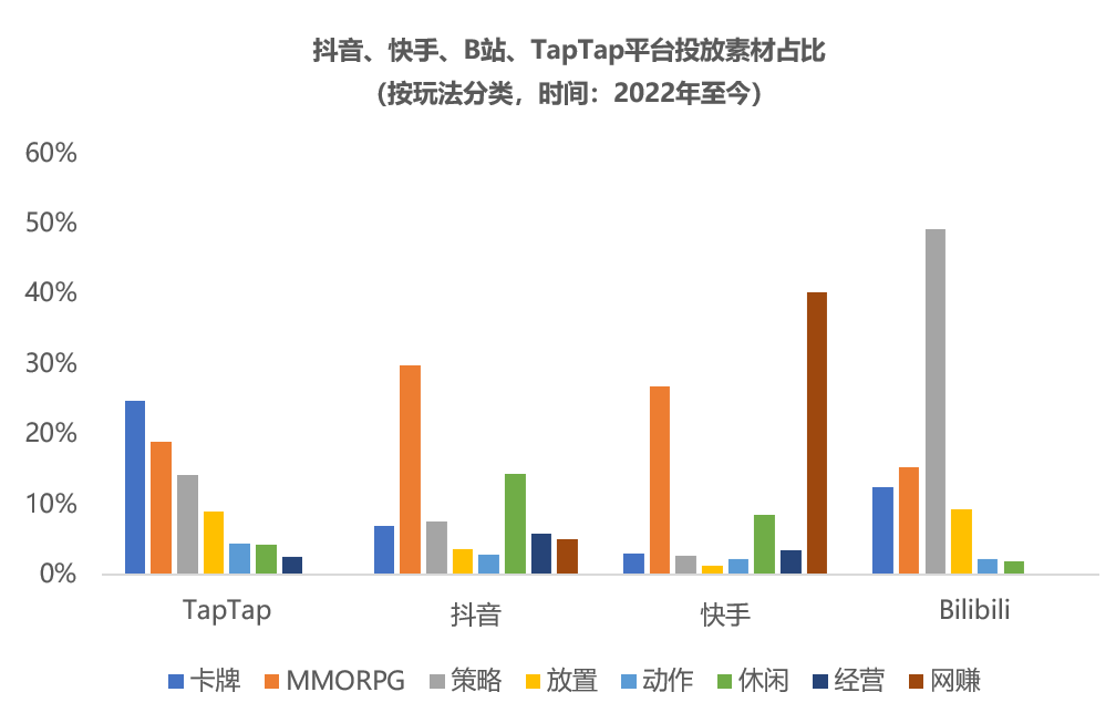 這反映出22年以來,越來越多的游戲廠商開始選擇TapTap這一新興渠道。從玩法來看,22年以來,在TapTap平臺投放游戲居前三的玩法分別是:卡牌、MMORPG和策略。