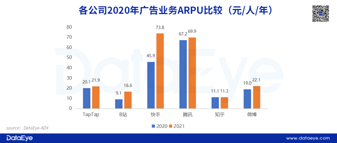 從廣告業(yè)務(wù)ARPU值來看,TapTap高于B站(21年是B站的1.3倍),較知乎、微博等平臺也具有一定優(yōu)勢,但遠不及騰訊和快手(21年是快手和騰訊的30%)。21年各公司ARPU值均有所上升,B站和快手增幅均超過50%,目前TapTap較B站的領(lǐng)先優(yōu)勢有所收窄。