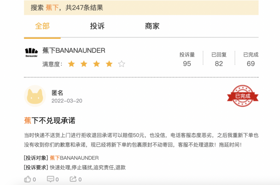 在黑貓投訴平臺上,蕉下投訴量已趨近百件,其中“防曬衣防曬指數(shù)不達標”、“雨傘質(zhì)量問題”“虛假宣傳”等問題屢見不鮮。
