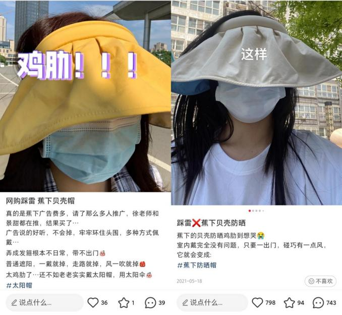 比如將防曬鏡片和帽子結合的養(yǎng)蜂人帽、防曬和發(fā)箍兩用的貝殼防曬帽等。不過,也有用戶在小紅書吐槽稱防曬帽很雞肋,比如“騎車不能帶,風大不能帶,除了自拍好看,一無是處”等等。