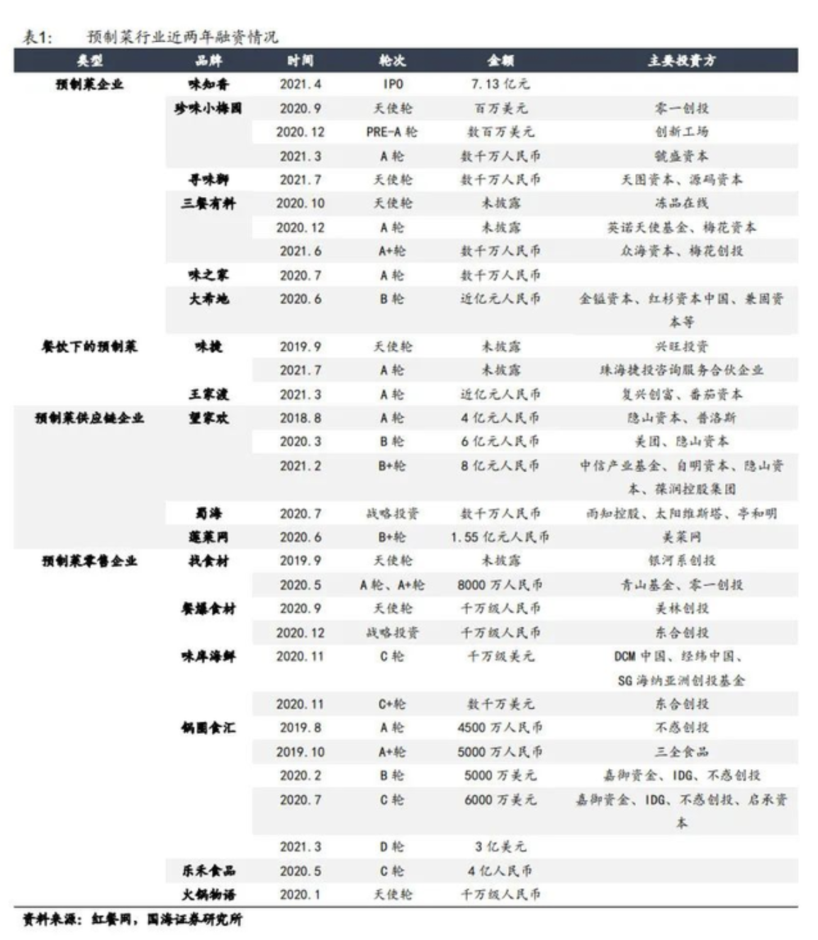 在行業(yè)快速擴(kuò)張中,嗅覺(jué)敏銳的資本紛紛入局。其中市場(chǎng)參與者有IDG、高瓴這樣的知名風(fēng)投機(jī)構(gòu),有美團(tuán)、盒馬鮮生這樣的外送平臺(tái),海底撈下屬的餐飲食材B2B公司蜀海、王家渡這樣的餐飲集團(tuán),還有傳統(tǒng)商超永輝超市旗下食材解決方案服務(wù)商彩食鮮。
