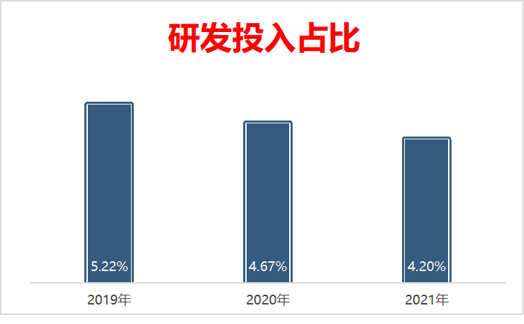 據(jù)公開(kāi)資料顯示,科沃斯2021年研發(fā)費(fèi)用為5.49億元,占營(yíng)收的比例為4.20%,而2019~2020年的研發(fā)投入占比分別為5.22%、4.67%,呈現(xiàn)逐年下降的趨勢(shì);銷售費(fèi)用為32.37億元,同比增長(zhǎng)107.39%,占營(yíng)收的比例為24.74%,是研發(fā)投入的近6倍。
