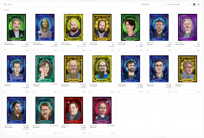 不光是Jillian York,這套由一名叫“It'sBlockchain”的組織發(fā)布了名為“Cipher Punks”的NFT資源包,涵蓋了46位不同人物的肖像,每個(gè)肖像令牌都有10個(gè)副本。其中的槽點(diǎn)不止是未經(jīng)允許發(fā)行,還包括拼錯(cuò)了多位人物的名字。
