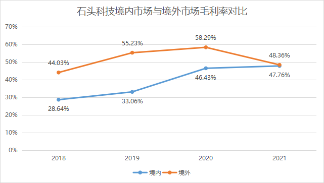 過去幾年,石頭科技境外市場一直在高速增長,而且海外市場毛利率始終都高于國內(nèi)市場。2019年,境外市場毛利率55.23%,境內(nèi)市場毛利率33.06%,相差22個百分點。2020年,境外市場毛利率更是達到了58%。