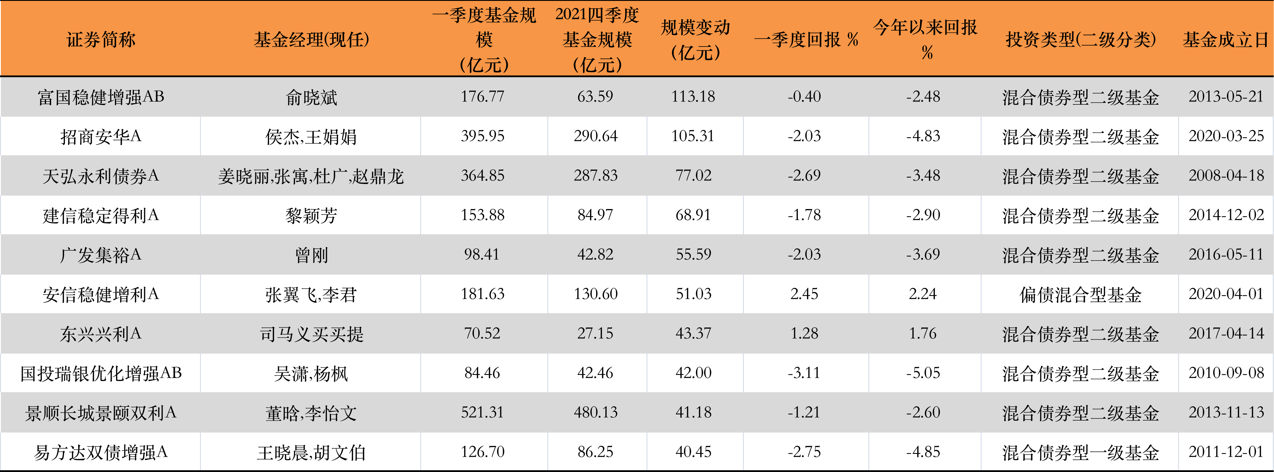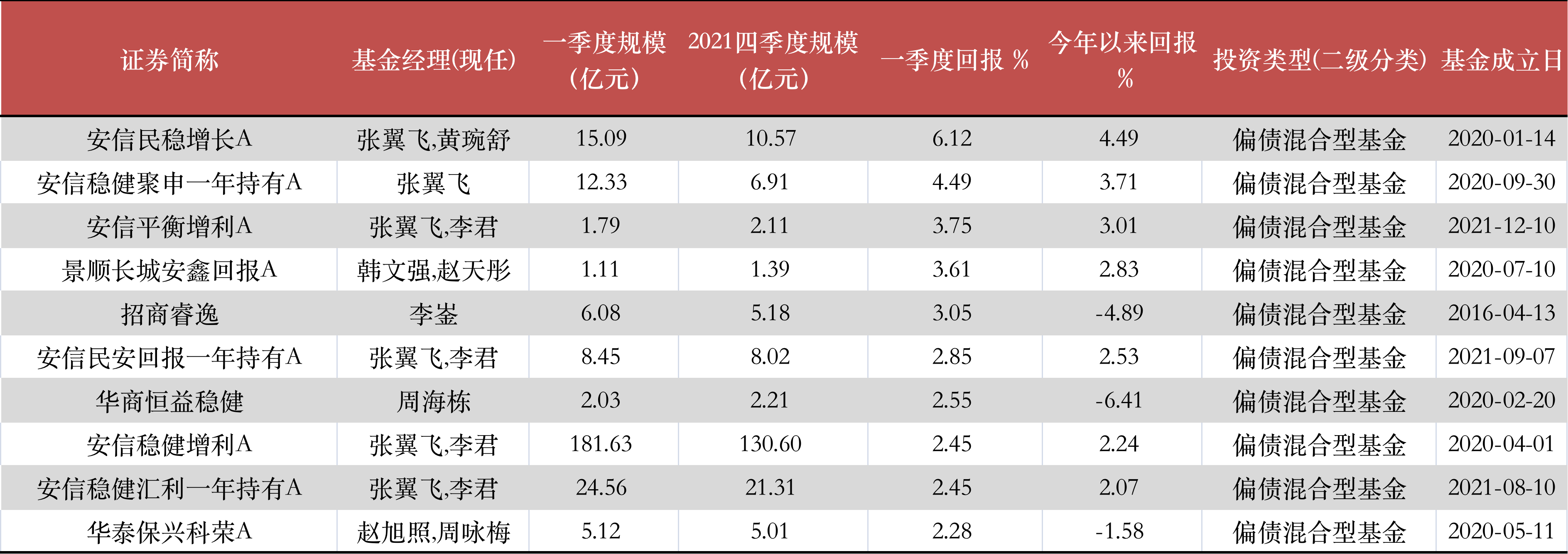 “固收+”基金整體業(yè)績表現(xiàn)不是很“暖心”,一季度僅8.2%的產(chǎn)品獲得正收益。負(fù)收益的“固收+”基金占比達(dá)到九成以上,其中凈值跌幅最大的產(chǎn)品,跌幅已經(jīng)超過了20%。界面新聞?dòng)浾呓y(tǒng)計(jì)了今年一季度“固收+”基金業(yè)績、規(guī)模榜單,其中業(yè)績排在前十位的基金如下表所示: