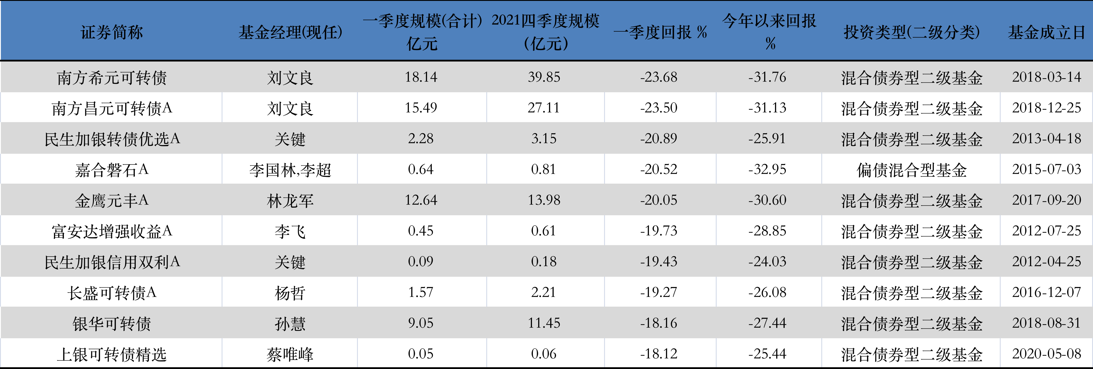 其中劉文良管理的南方希元可轉(zhuǎn)債“受傷”最為嚴(yán)重,一季度回報(bào)為-23.68%,今年以來回報(bào)為-31.76%。由于業(yè)績不佳,投資者們也紛紛選擇贖回,一季度凈贖回份額為8.04億份,規(guī)模也一度縮水至18.14億元。