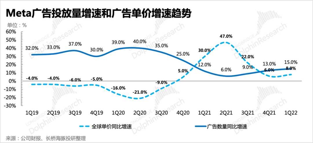 無論在元宇宙里,Meta被市場及管理層描繪得多么“前景璀璨”,短期里廣告依舊是Meta的命根子。但今年行業(yè)面臨的大逆風(fēng),使得收入貢獻(xiàn)近97%的Meta,幾乎無力抵抗逆風(fēng)帶來的增長壓制。