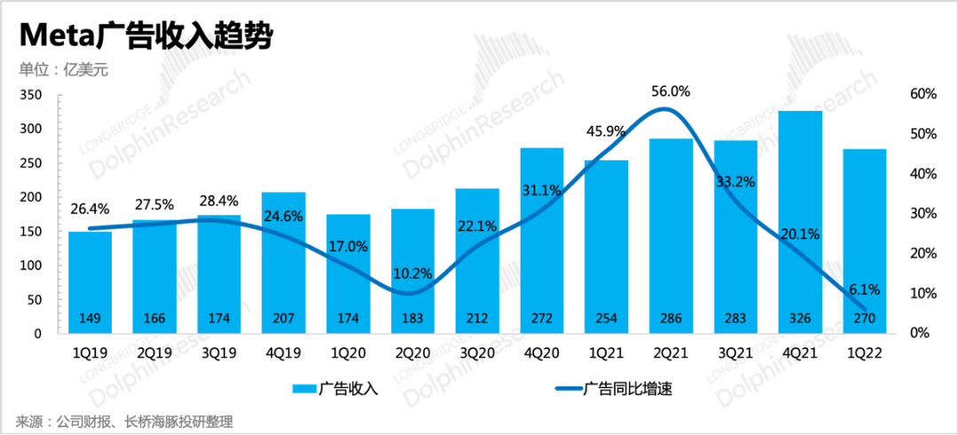 一季度實(shí)現(xiàn)廣告收入270億美元,同比增長6.1%,與市場預(yù)期比差3億。如果廣告貢獻(xiàn)占比不變,按照二季度的總營收指引,估計(jì)二季度廣告收入在271~291億區(qū)間,很可能面臨負(fù)增長。二季度逆風(fēng)因素并不比一季度少,除了高基數(shù),還包括通脹、戰(zhàn)爭、蘋果ATT以及競爭加劇的多重影響。