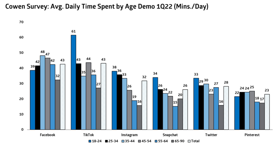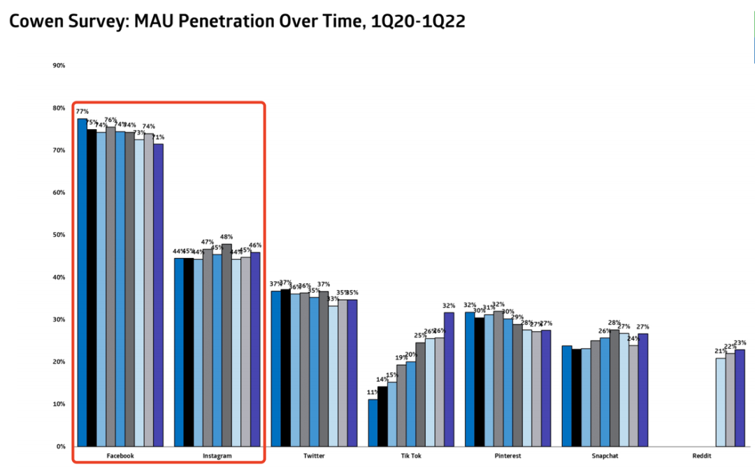 (1)Facebook在全球的滲透率最高,也預(yù)示著向上空間也已不大,尤其是在年輕用戶群體中,F(xiàn)acebok并沒有太大的吸引力。從下圖Cowen的跟蹤調(diào)研可以看出,在18-34歲的年齡層,F(xiàn)acebook與Tiktok比完全不占優(yōu)勢(shì),并且整體上Facebook的用戶滲透率實(shí)際是在不斷走低的,即FB用戶增長的背后是更多的是靠互聯(lián)網(wǎng)流量大盤增長的帶動(dòng)。