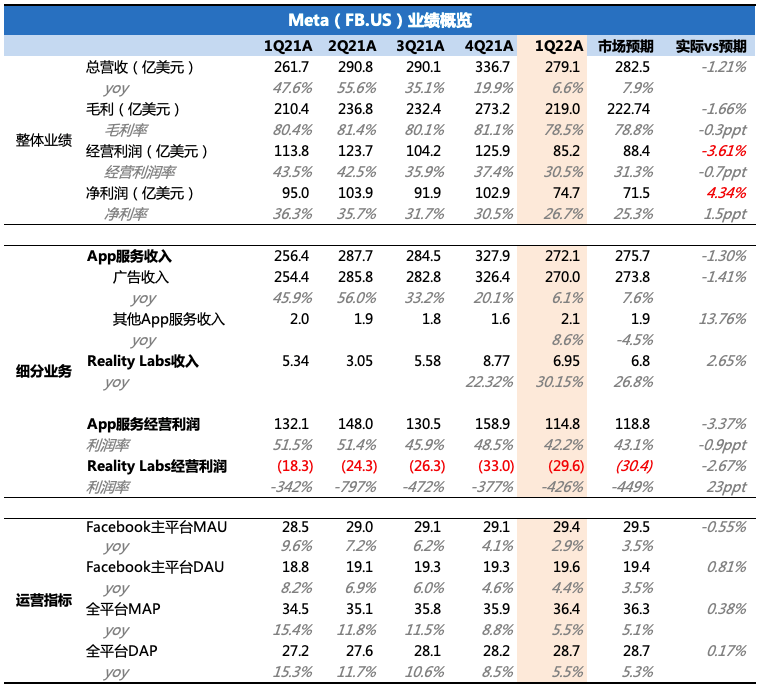(Facebook)$Meta.US 今晨發(fā)布 2022年一季度財(cái)報(bào),業(yè)績本身并不好看,但預(yù)期夠低,部分利空已經(jīng)定價(jià)。