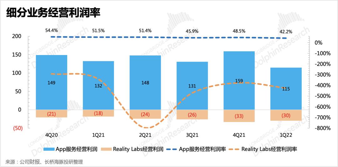 雖然有Reality Labs代表的VR/AR以及元宇宙戰(zhàn)略的投入加大影響,但從分業(yè)務(wù)獲利情況來看,元宇宙并不能背這個(gè)鍋,以廣告為主的App服務(wù)自身就受到收支錯(cuò)配帶來的利潤受損,無論是宏觀環(huán)境、iOS ATT政策、Reels變現(xiàn)率低等影響,背后本質(zhì)還是逃不開消費(fèi)互聯(lián)網(wǎng)競爭加劇和Meta的壁壘削弱,而目前的Reality Labs還遠(yuǎn)遠(yuǎn)不足以堪當(dāng)?shù)诙鲩L曲線的重任。