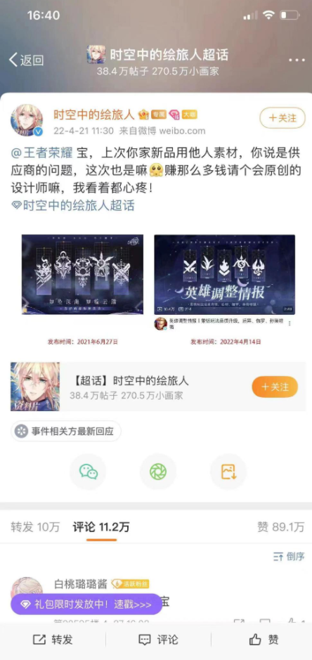 4月21日,一則“陰陽怪氣”的微博將騰訊(00700.HK)旗下手游《王者榮耀》送上了熱搜,發(fā)出此條微博的則是網(wǎng)易旗下手游《時空中的繪旅人》官微,在該條微博中,還配上了兩款游戲的素材對比圖,以此來指控《王者榮耀》抄襲。