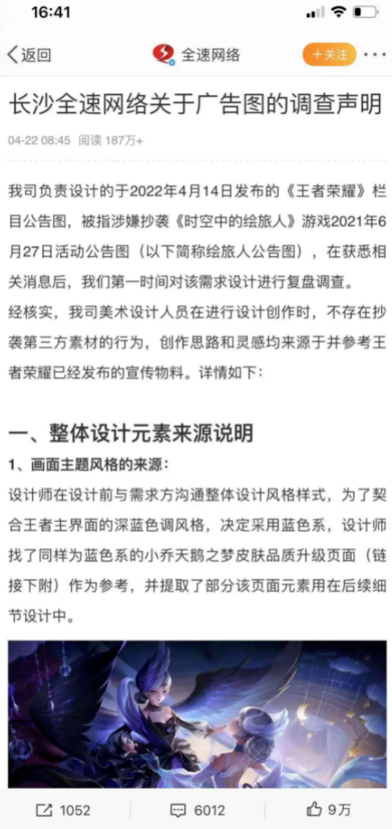 事件發(fā)酵不久后,《王者榮耀》供應(yīng)商全速網(wǎng)絡(luò)發(fā)布公告稱“會盡快作出完整說明”,并在次日發(fā)布的調(diào)查聲明中稱“不存在抄襲第三方素材的行為”。