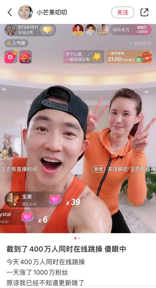 劉畊宏的健身直播火了。 日前,劉畊宏的抖音直播同時(shí)觀看人數(shù)最高達(dá)到400萬,他的抖音賬號(hào)甚至實(shí)現(xiàn)一天漲粉1000萬的數(shù)據(jù)?!皠u宏女孩”們除了直播跟練,也通過抖音、小紅書等線上平臺(tái)分享跟練視頻和心得。據(jù)小紅書4月22日發(fā)布的熱門話題,#打卡劉畊宏健身操#這一話題熱度高達(dá)1520W,為當(dāng)周TOP2的話題。