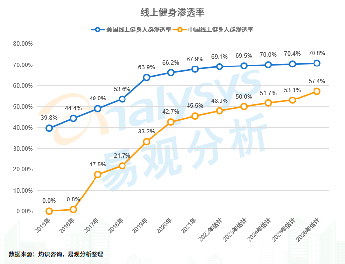 從滲透率數(shù)據(jù)來看,我國(guó)線上健身在2016年之后迅速普及。據(jù)灼識(shí)咨詢報(bào)告,2021年我國(guó)線上健身人群滲透率達(dá)45.5%,美國(guó)為67.9%。預(yù)計(jì)到2026年,中國(guó)線上健身人群滲透率將達(dá)到57.4%。