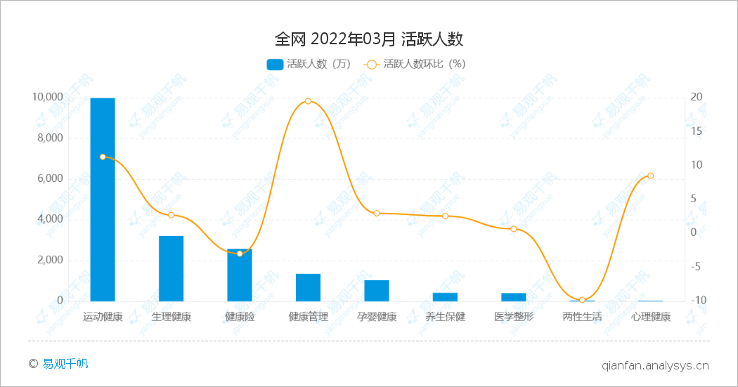 從3月數(shù)據(jù)來看,運(yùn)動(dòng)健康類APP仍在整個(gè)健康領(lǐng)域中位居第一,3月活躍人數(shù)環(huán)比增加11.31%。同時(shí)健康管理、心理健康類APP活躍人數(shù)環(huán)比同樣走高。