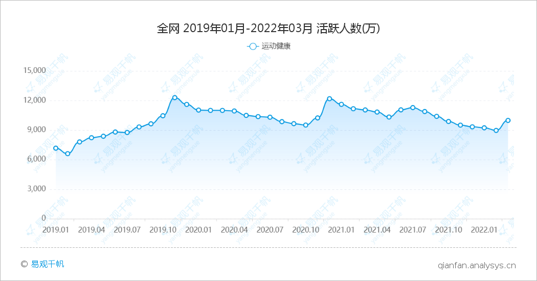 健身市場(chǎng)規(guī)模不斷增長(zhǎng)的同時(shí),線上健身市場(chǎng)占比也在逐漸提高,且預(yù)計(jì)即將超過線下渠道。此外滲透率的不斷走高,也同樣預(yù)示線上健身將成為主流健身渠道之一。 疫情同樣加速了線上健身的發(fā)展,自2019年至今運(yùn)動(dòng)健康行業(yè)活躍人數(shù)呈波動(dòng)增加趨勢(shì)。據(jù)易觀千帆數(shù)據(jù),2019年末、2020年末、2021年夏及剛剛結(jié)束的3月,運(yùn)動(dòng)健康行業(yè)均出現(xiàn)了活躍人數(shù)的小高峰。