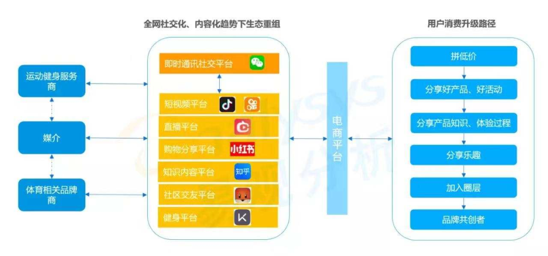 劉畊宏、帕梅拉等這些運(yùn)動(dòng)達(dá)人、健身KOL作為內(nèi)容提供方,通過抖音、快手、小紅書、B站等內(nèi)容平臺(tái)和keep等健身app發(fā)布,使用戶能夠在家通過手機(jī)便捷觀看。同時(shí),Keep等主打健身的專業(yè)app日漸主流,健身手環(huán)等智能設(shè)備逐漸普及,適合室內(nèi)運(yùn)動(dòng)的無繩跳繩、瑜伽墊等健身器材關(guān)注度走高,同樣都成為居家健身這個(gè)產(chǎn)業(yè)鏈中的一環(huán)。 不得不承認(rèn)的是,在當(dāng)前全網(wǎng)社交化、內(nèi)容化的趨勢(shì)下,整個(gè)體育產(chǎn)業(yè)生態(tài)已經(jīng)開始重組。易觀分析認(rèn)為,云端場(chǎng)景化健身不斷降低居民運(yùn)動(dòng)門檻、增強(qiáng)專業(yè)性。內(nèi)容化、電商化、社交化、互動(dòng)化的融合性平臺(tái)也將在產(chǎn)業(yè)重組后逐漸占據(jù)主導(dǎo)地位。