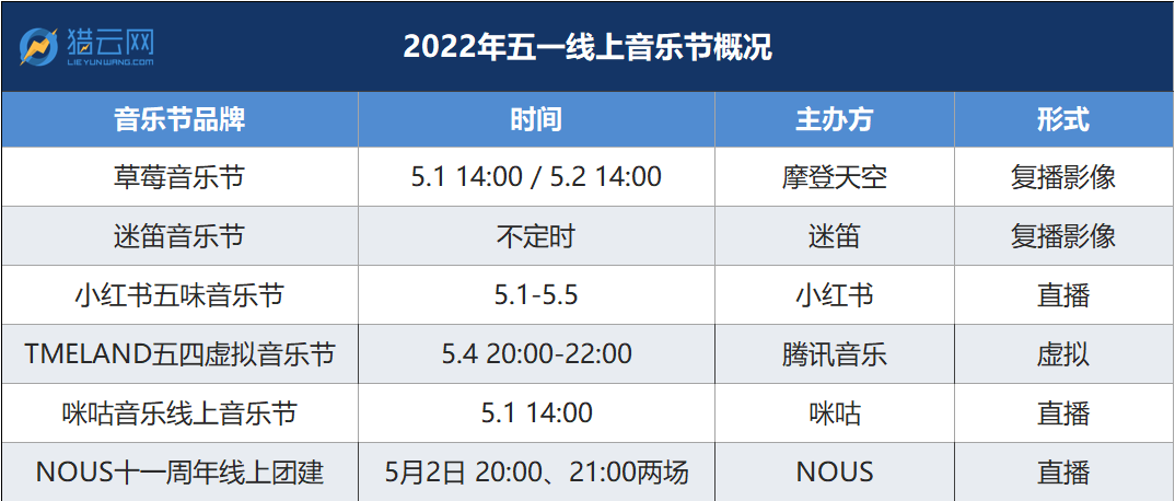 獵云網(wǎng)根據(jù)公開(kāi)資料整理,今年五一至少有六場(chǎng)線上音樂(lè)節(jié)。