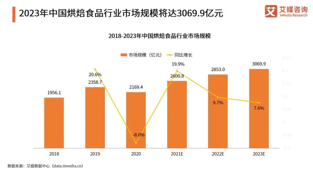 據(jù)艾媒體咨詢數(shù)據(jù)統(tǒng)計顯示,2013年之后,中國烘焙市場規(guī)模常年維持在2200億元之上。到了2021年,中國烘焙食品市場規(guī)模預估達2600.8億元,同比增長19.9%,按照這一增速,2023年,烘焙行業(yè)將正式邁出3000億元大關(guān)。