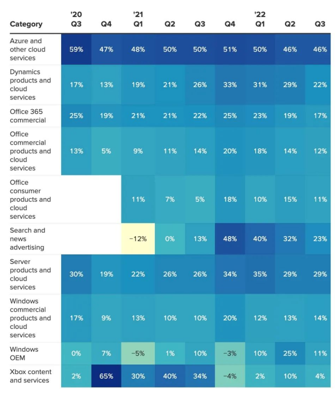 相比之下,微軟成為GAMMA乃至整個(gè)科技股“最后的榮光”,核心指標(biāo)全面超市場(chǎng)預(yù)期:季度內(nèi)營收493.6億美元,同比增長(zhǎng)18%;利潤167億美元,同比增長(zhǎng)8%;每股凈收益為2.22美元,高于分析師預(yù)期2.19美元;Azure和其它云服務(wù)增速46%,持平此前的高速增長(zhǎng)。