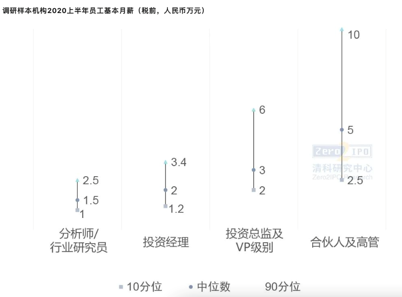 清科研究中心曾在去年發(fā)布了《2020年VC/PE機(jī)構(gòu)薪酬與運(yùn)營機(jī)制調(diào)查研究報告》,報告顯示,VC/PE機(jī)構(gòu)里各職級中等工資水平(中位數(shù))分別為:1.5萬元(分析師/研究員)、2萬元(投資經(jīng)理)、3萬元(投資總監(jiān))和5萬元(合伙人及以上)。