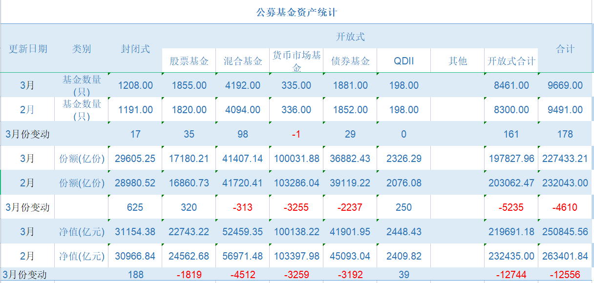 今日傍晚,中國基金業(yè)協(xié)會公布了3月份公募基金的資產(chǎn)數(shù)據(jù)。