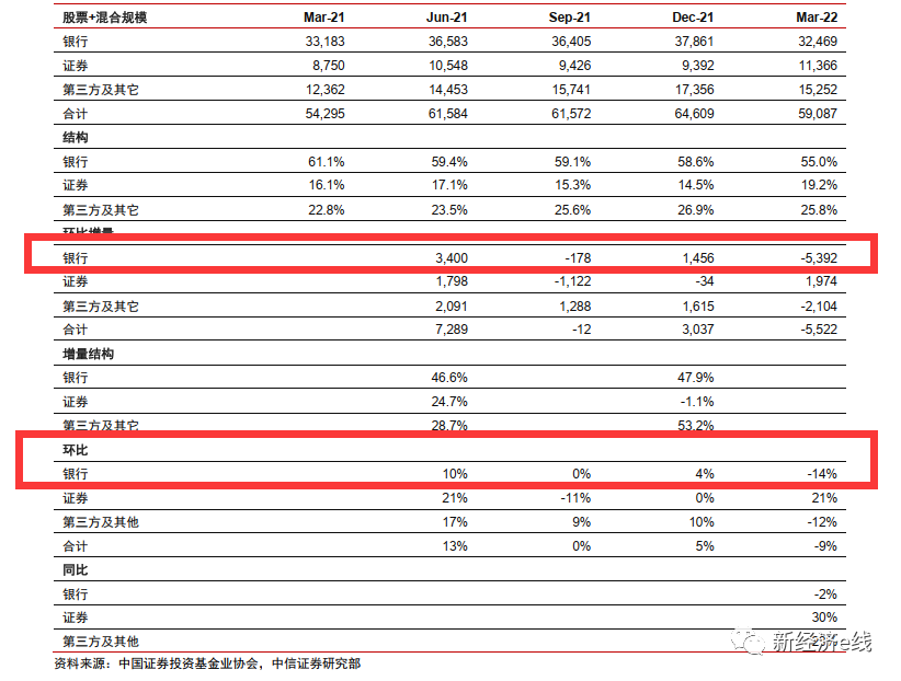 如在2021年Q1至2022年Q1的五個季度里,銀行股票+混合基金市場占比分別為61.1%、59.4% 、59.1%、58.6%、55.0%。截至今年一季度末,銀行代銷股票+混合基金保有規(guī)模為3.25萬億元,環(huán)比減少14%。