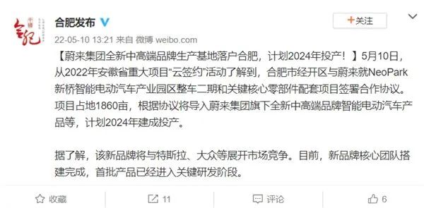 5月10日,“合肥發(fā)布”的一則消息曝光了蔚來全新品牌的動(dòng)態(tài)。