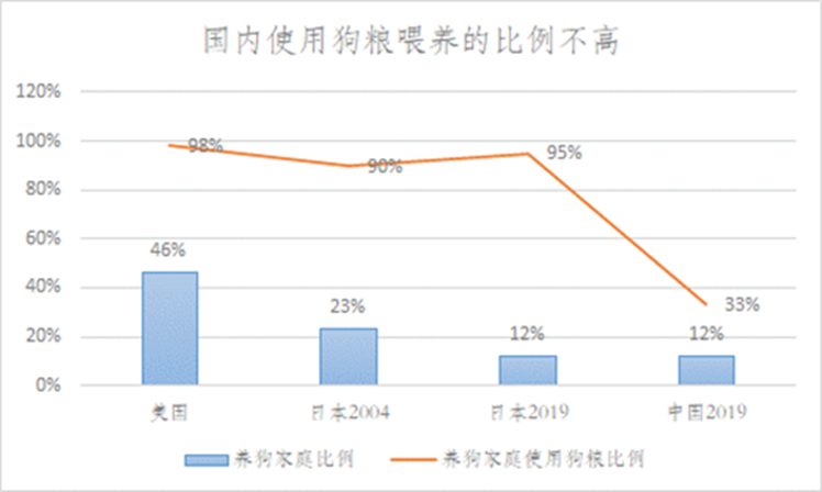 美國(guó)約有6000萬(wàn)(近一半)家庭養(yǎng)狗,平均每個(gè)家庭養(yǎng)狗1.4只,總數(shù)約為8400萬(wàn)只,狗糧的普及率接近100%;在日本,約23%的家庭在2004年的高峰期養(yǎng)狗,狗糧的普及率約為90%。