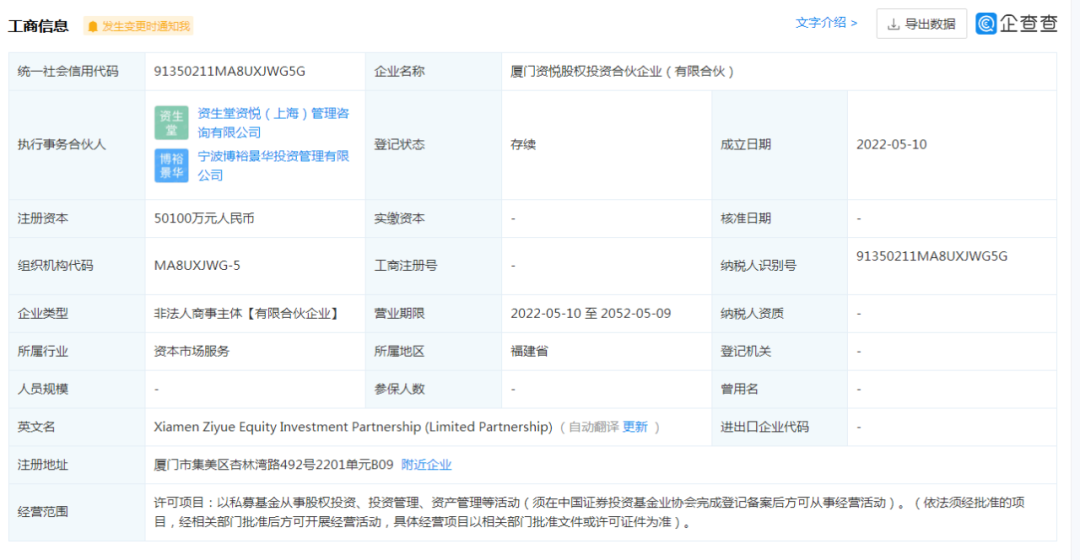 5月10日,廈門資悅股權(quán)投資合伙企業(yè)成立,經(jīng)營范圍包含以私募基金從事股權(quán)投資、投資管理、資產(chǎn)管理等活動(dòng)。信息顯示,該公司由資生堂(中國)投資有限公司(“資生堂中國”)、資生堂資悅(上海)管理咨詢有限公司(“資生堂資悅”)、寧波博裕景華投資管理有限公司(“博裕景華”)共同持股,注冊資本5.01億元人民幣。