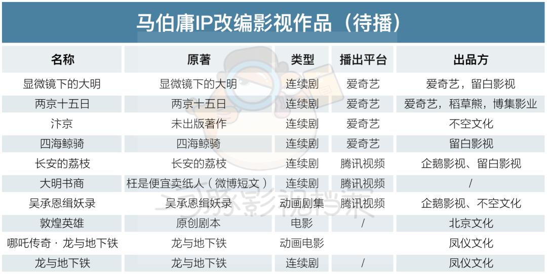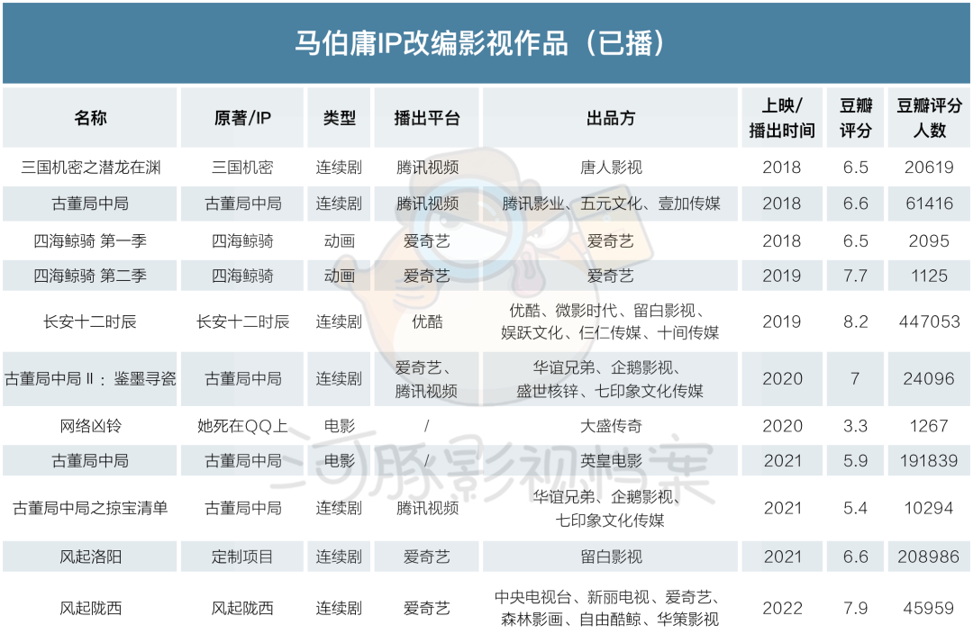 據(jù)不完全統(tǒng)計(jì),包括《風(fēng)起隴西》在內(nèi),由馬伯庸原著小說(shuō)直接改編而來(lái)的影視作品共有11部,自2018年開始保持著每年2-3部的穩(wěn)定輸出,10部待播項(xiàng)目也處于不同制作階段,是各個(gè)平臺(tái)強(qiáng)勢(shì)IP儲(chǔ)備的重要來(lái)源。