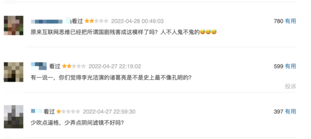 同時(shí),與大批用戶高呼良心劇情、精彩情節(jié)設(shè)計(jì)相對(duì)應(yīng)的,是同樣為數(shù)不少的觀眾針對(duì)劇集畫面過(guò)暗、短時(shí)間出場(chǎng)人物過(guò)多、三國(guó)的歷史被魔改、人物臺(tái)詞在古代與現(xiàn)代之間來(lái)回橫跳等方面的吐槽。