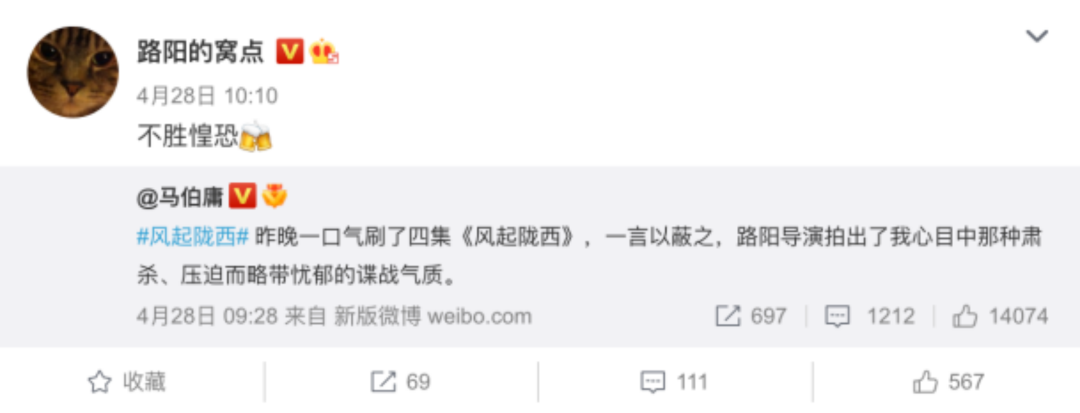 類型元素的拼貼與融入一定程度上也有利于話題營(yíng)銷。《長(zhǎng)安十二時(shí)辰》打出的標(biāo)簽是古代城市反恐,《風(fēng)起洛陽(yáng)》曾經(jīng)打出過(guò)武周版“神盾局特工”的旗號(hào),《風(fēng)起隴西》的定位是古代諜戰(zhàn)+職場(chǎng),在微博上也可以看到劇方配合這一定位的宣傳物料。