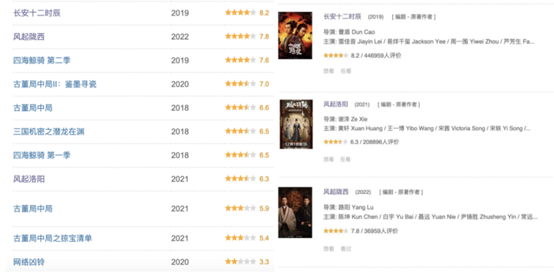 但與此同時(shí),細(xì)數(shù)這些影視改編作品的過(guò)往表現(xiàn),劇集方面,除《長(zhǎng)安十二時(shí)辰》評(píng)分突破8分、觀看人數(shù)達(dá)到了44萬(wàn)人以外,《風(fēng)起隴西》評(píng)分在7.9分,其他作品的評(píng)分大多都在6.5分左右徘徊,熱度也遠(yuǎn)不及《慶余年》等爆款I(lǐng)P改編劇集。
