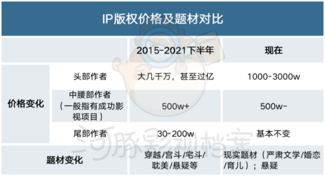 時(shí)間來(lái)到2020年以后,IP改編的外部環(huán)境發(fā)生了重大變化。首先是IP 行業(yè)降溫,IP改編的數(shù)量和價(jià)格都急速下降,以年初一家版權(quán)公司副總裁對(duì)媒體透露的情況來(lái)看,公司內(nèi)部IP成交量比高峰時(shí)期下降九成,價(jià)格也經(jīng)歷了大跳水。不過(guò)從變化的細(xì)部來(lái)看,古裝和現(xiàn)實(shí)主義的題材仍然是IP影視改編的香餑餑。影視行業(yè)“降本增效”實(shí)際加重了資源向頭部IP的傾斜和集中,之前一位業(yè)內(nèi)人士曾向河豚君透露,價(jià)格腰斬后。要簽下像馬伯庸這樣的作家,仍然需要兩千到三千萬(wàn)。