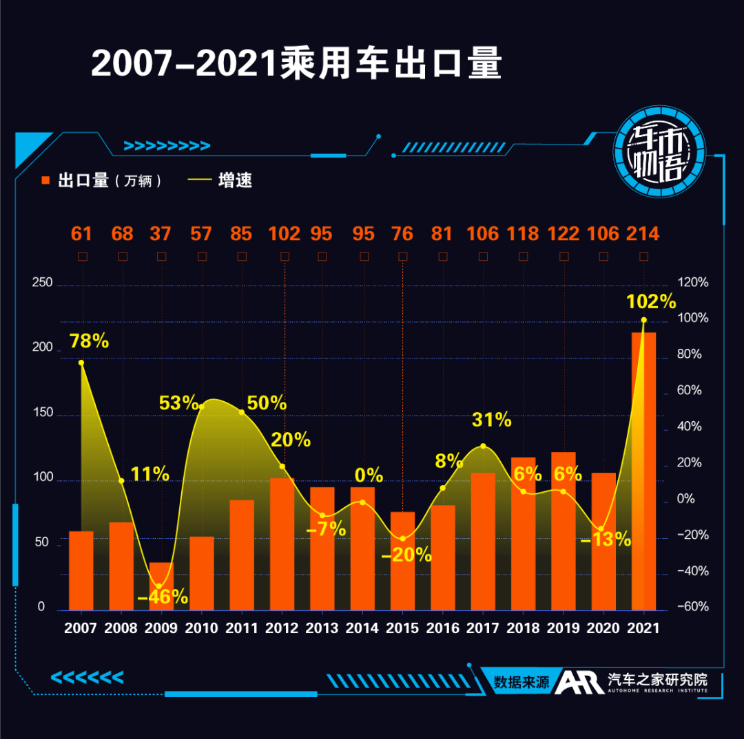 中汽協(xié)數(shù)據(jù)顯示,2021年,中國汽車出口達到201.5萬輛,同比增長1倍,占汽車銷售總量的比重為7.7%,比上年提升3.7個百分點。翻番并不是件容易的事。多年以來,中國汽車出口曾長期在100萬輛左右的規(guī)模徘徊。