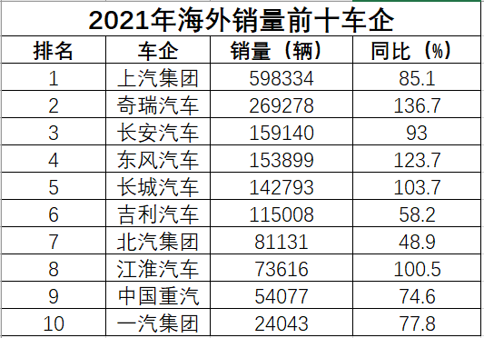 在2021年,伴隨著總量翻倍,不少車企也收獲了出海的新里程碑。上汽集團在海外市場創(chuàng)下了69.7萬輛的銷量成績,以78.9%的同比增速刷新歷史紀錄;奇瑞汽車出口量達26.9萬輛,創(chuàng)下歷史新高。