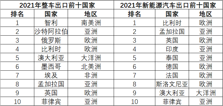 海關數(shù)據(jù)顯示,2021年,中國新能源汽車出口量排名前十位國家依次是比利時、孟加拉國、英國、印度、泰國、德國、法國、斯洛文尼亞、澳大利亞和菲律賓。