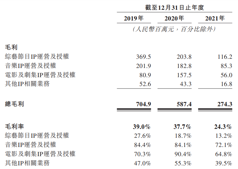 從業(yè)務來看,綜藝節(jié)目IP運營及授權是星空華文主要的營收來源。2021年,綜藝節(jié)目IP運營及授權收入為8.8億元,占公司收入百分比的78%。然而,該項業(yè)務毛利率下降幅度較大。2019至2021年,綜藝節(jié)目IP運營及授權毛利率分別為39.0%、37.7%、24.3%。