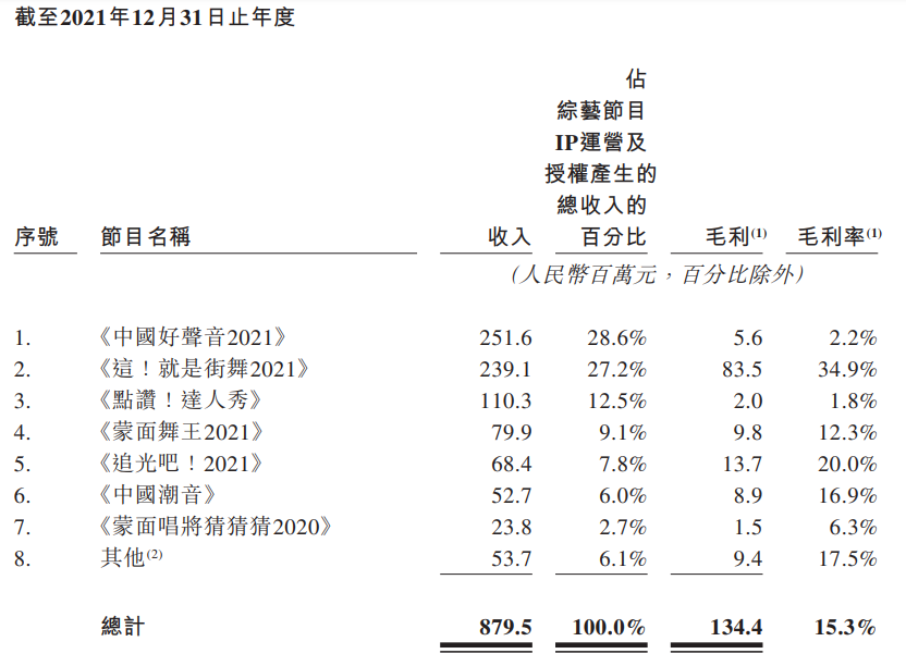 根據(jù)弗若斯特沙利文報告,按2020年收入計,公司是中國最大綜藝節(jié)目IP創(chuàng)造商及運營商,市場份額為2.0%。2012年,公司推出中國最受歡迎的歌唱比賽節(jié)目之一《中國好聲音》,播出十季后,創(chuàng)下中國季播持續(xù)時間最長的綜藝節(jié)目紀錄。