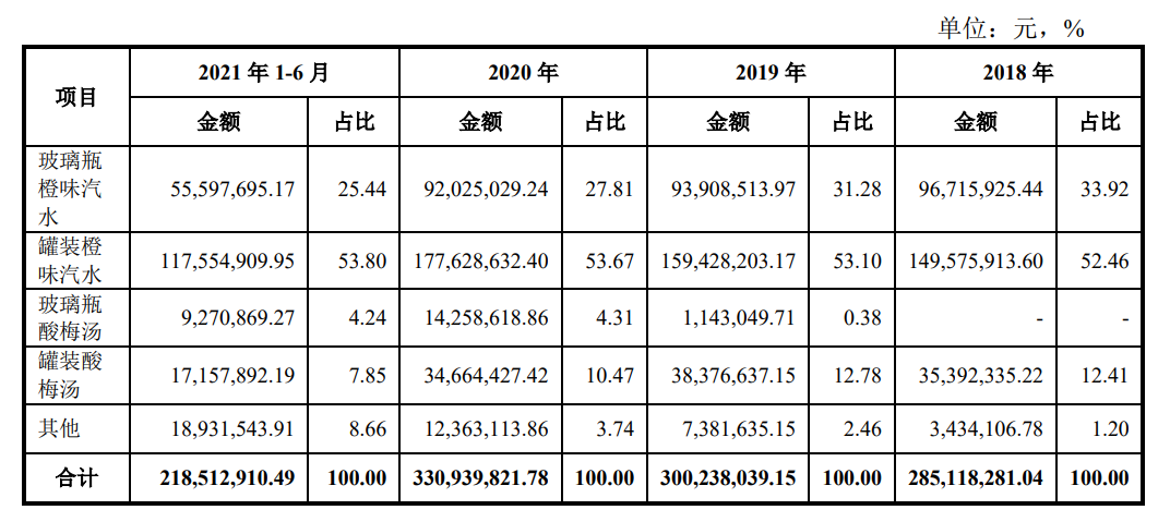 遺憾的是,這些新品未能復(fù)制玻璃瓶橙味汽水的輝煌,市場反響平平。如玻璃瓶酸梅湯,2021年上半年只貢獻了4.24%的營收,罐裝酸梅湯為7.85%,其他產(chǎn)品合計8.66%。