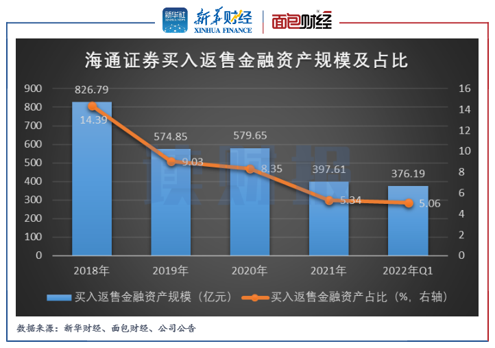 2022年一季末,海通證券的買(mǎi)入返售金融資產(chǎn)為376.19億元,較上年年末下降5.39%。2018年以來(lái),公司的買(mǎi)入返售金融資產(chǎn)規(guī)模及占總資產(chǎn)的比例整體呈下滑趨勢(shì),公司或意欲控制該業(yè)務(wù)所帶來(lái)的信用風(fēng)險(xiǎn)。