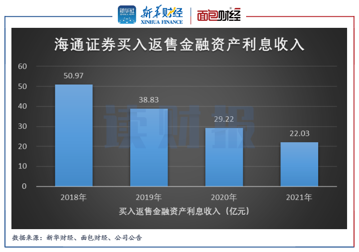 由于買(mǎi)入返售金融資產(chǎn)規(guī)模的縮減,海通證券由此產(chǎn)生利息收入相應(yīng)減少。2021年,公司買(mǎi)入返售金融資產(chǎn)利息收入為22.03億元,同比減少24.61%。