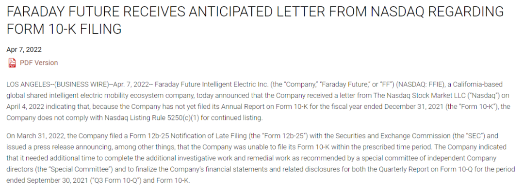 上月初,F(xiàn)F發(fā)布公告稱,其已收到來自納斯達(dá)克的通知信函,通知中表明由于其尚未及時提交截至2021年12月31日的10-K年度報告,違反了納斯達(dá)克上市規(guī)則第5250(c)(1)條。