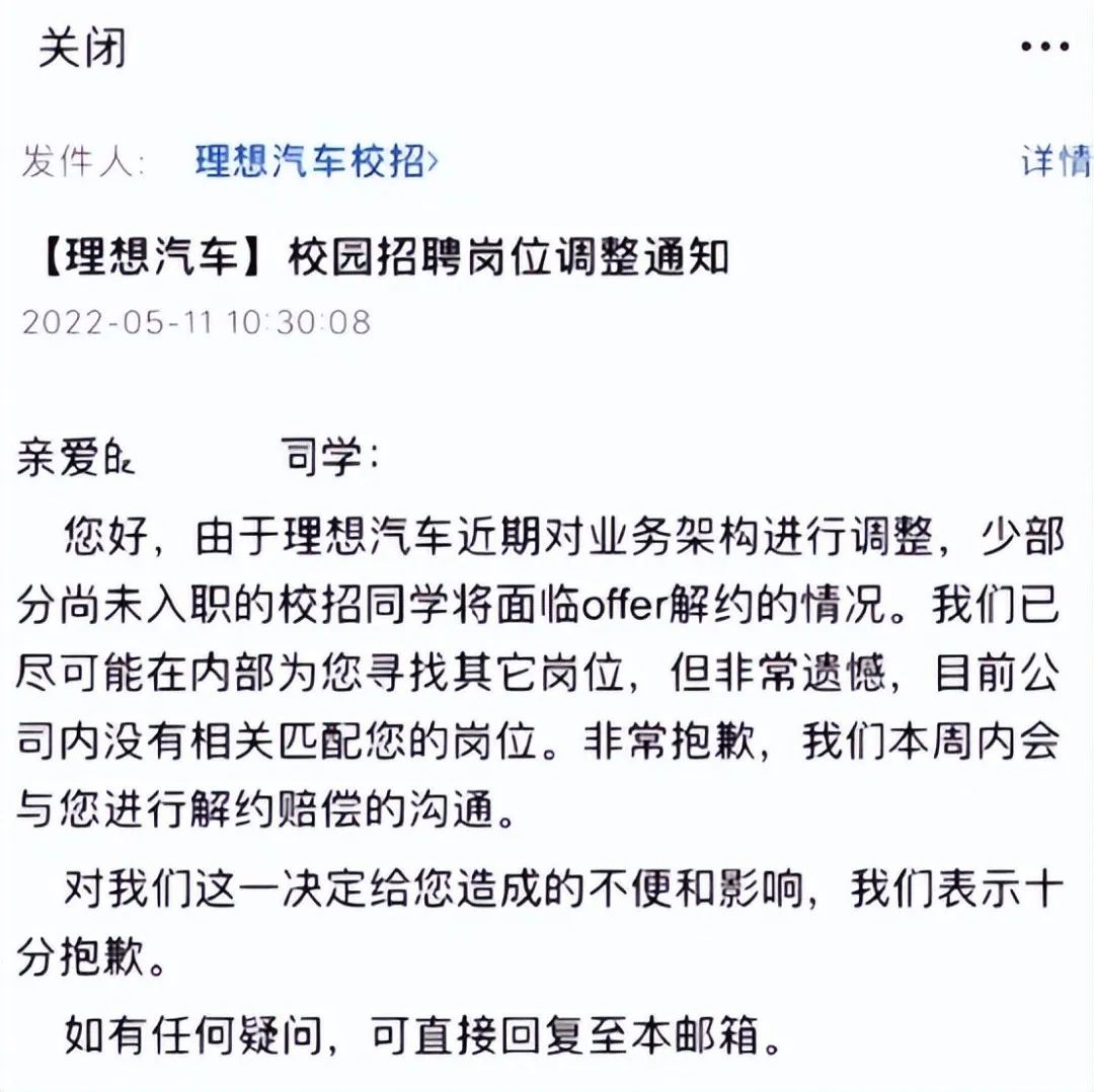 5月11日,有用戶在某職場社交軟件爆料稱,理想汽車在5月“毀約”了一部分2022屆校招生。隨后,理想汽車官方向媒體確認了這一消息。