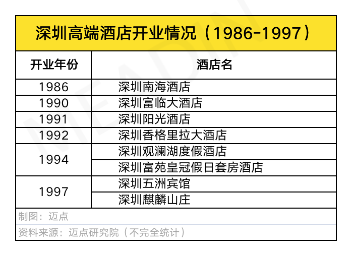 據(jù)邁點研究院不完全統(tǒng)計,進入21世紀以前,深圳共開業(yè)8家高端酒店,除了1992年開業(yè)的深圳香格里拉酒店及1994年開業(yè)的深圳富苑皇冠假日套房酒店屬于國際高端酒店以外,其余均為本土高端酒店,且均勻分布在深圳的羅湖區(qū)、南山區(qū)、龍華區(qū)和福田區(qū),成為各分區(qū)極具代表性的地標建筑。