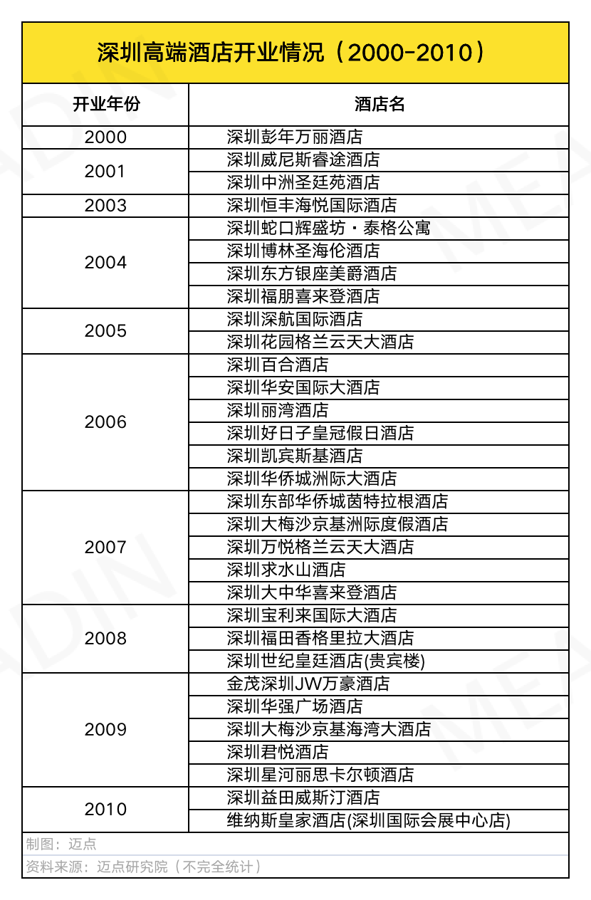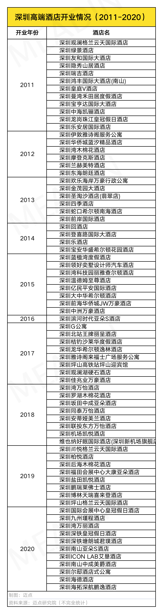 據(jù)邁點研究院不完全統(tǒng)計,在接下來的十年中,深圳共開業(yè)了72家高端酒店,僅2011年就開業(yè)了12家。