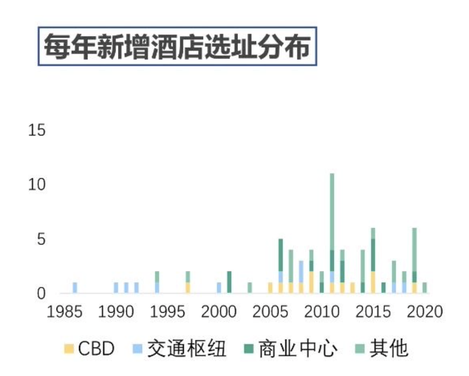 最后,獨特的城市定位構(gòu)筑了深圳獨特“高端商務(wù)酒店為主”的市場布局。此前邁點分析重慶、香港、上海等城市高端酒店市場時,酒店品類的多元化是高端酒店發(fā)展的重要特點之一,但深圳卻有所不同。實際上,僅從酒店名稱來看,深圳開業(yè)的120余家高端酒店僅有5家?guī)в卸燃俚拿黠@字樣,而從酒店介紹來看,大多數(shù)以靠近交通中心和中心CBD為主要賣點。據(jù)不完全統(tǒng)計,在1985至2000年,深圳高端酒店大多位于羅湖火車站附近,而在2001年以后,大多數(shù)酒店則選擇開業(yè)在CBD和商業(yè)中心附近。